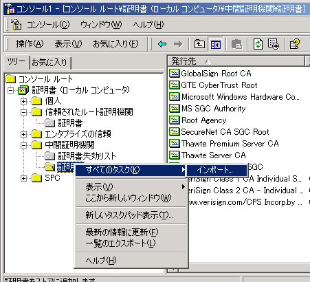 - 証明書が表示されることを確認します。[中間証明機関]→[証明書]上にてマウスを右